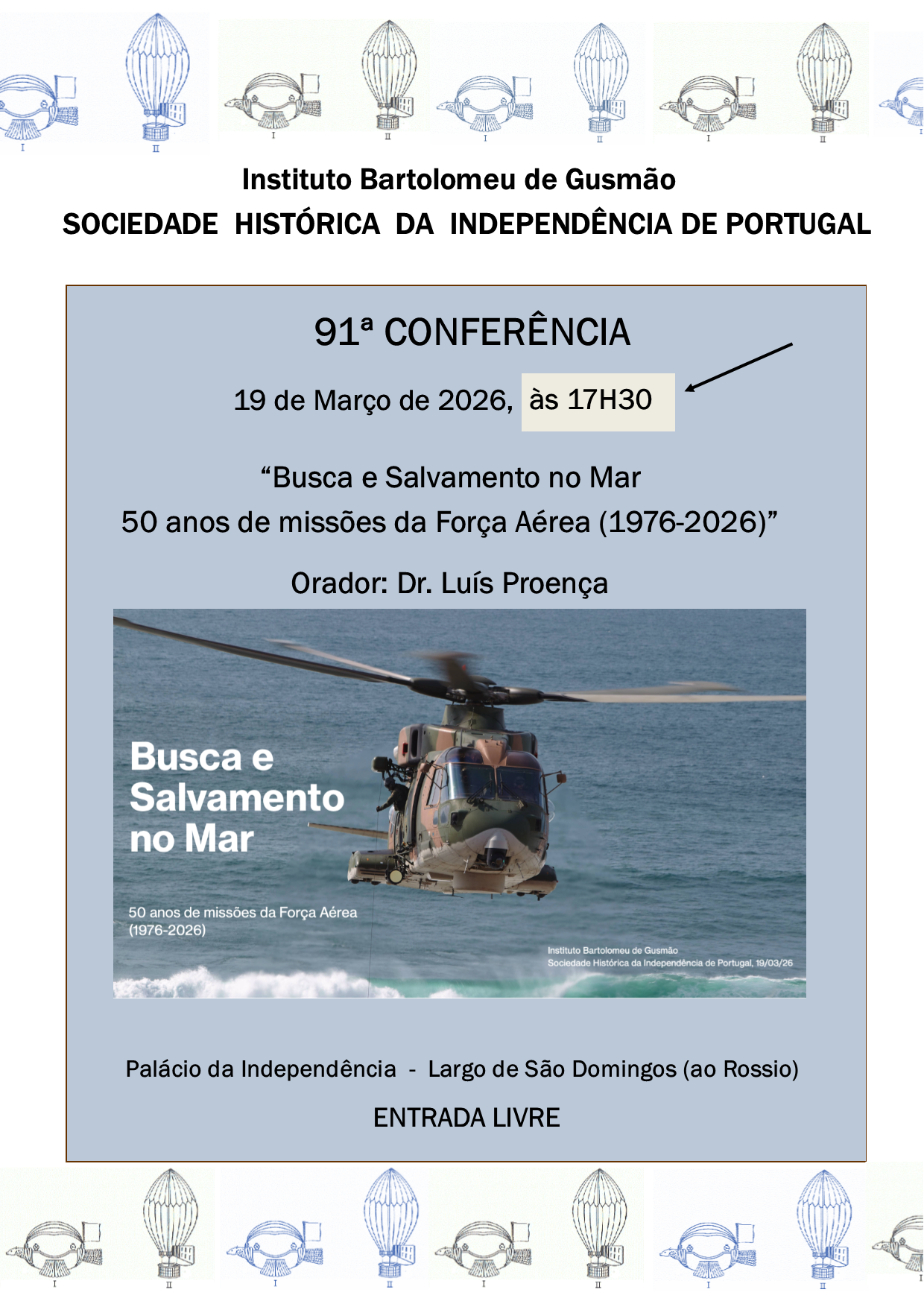 No dia 19 de março de 2026, às 17h30, a sua 91.ª conferência intitulada “Busca e Salvamento no Mar — 50 anos de missões da Força Aérea (1976–2026)”. Proferida pelo Dr. Luís Proença. A sessão irá revisitar alguns dos principais episódios destas missões, evidenciando a evolução dos meios aéreos, dos procedimentos operacionais e da cooperação...